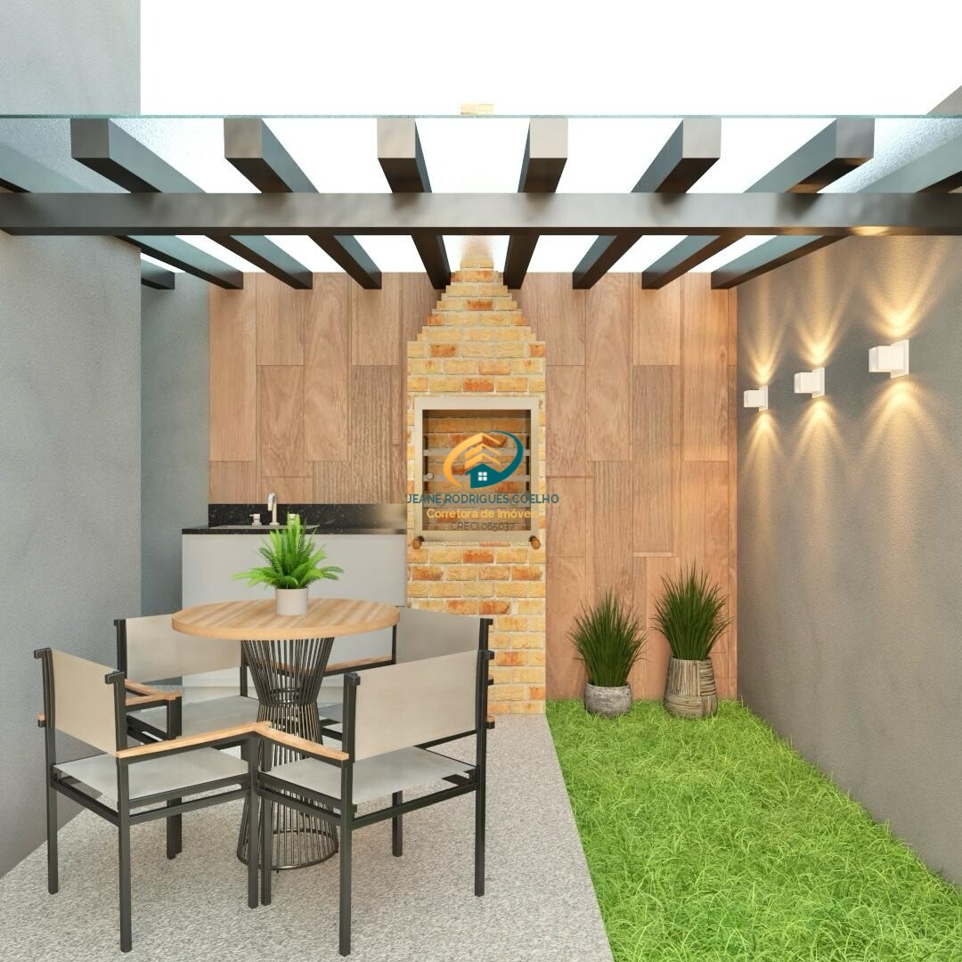 - área gourmet, com churrasqueira, bancada e chuveirão