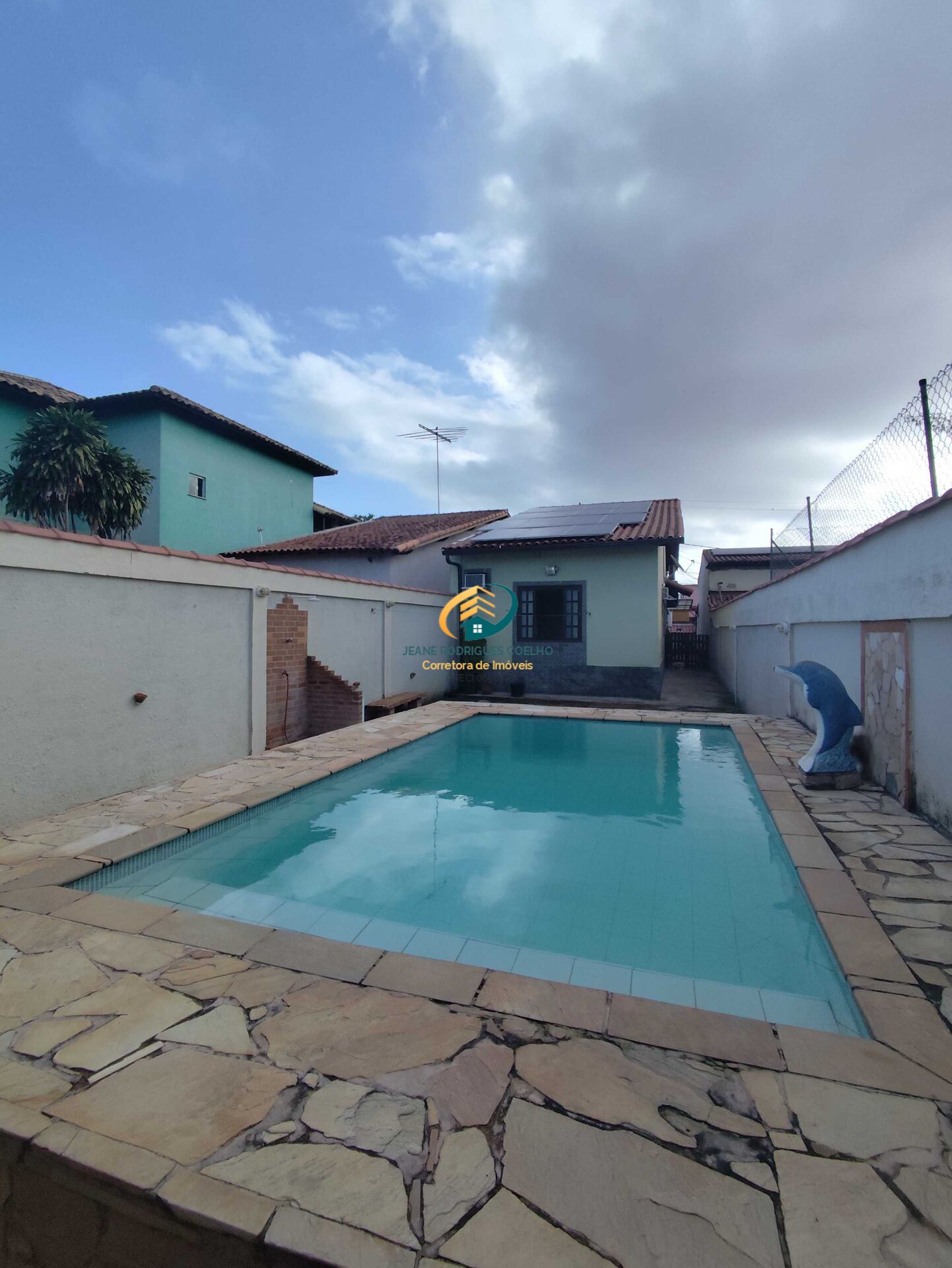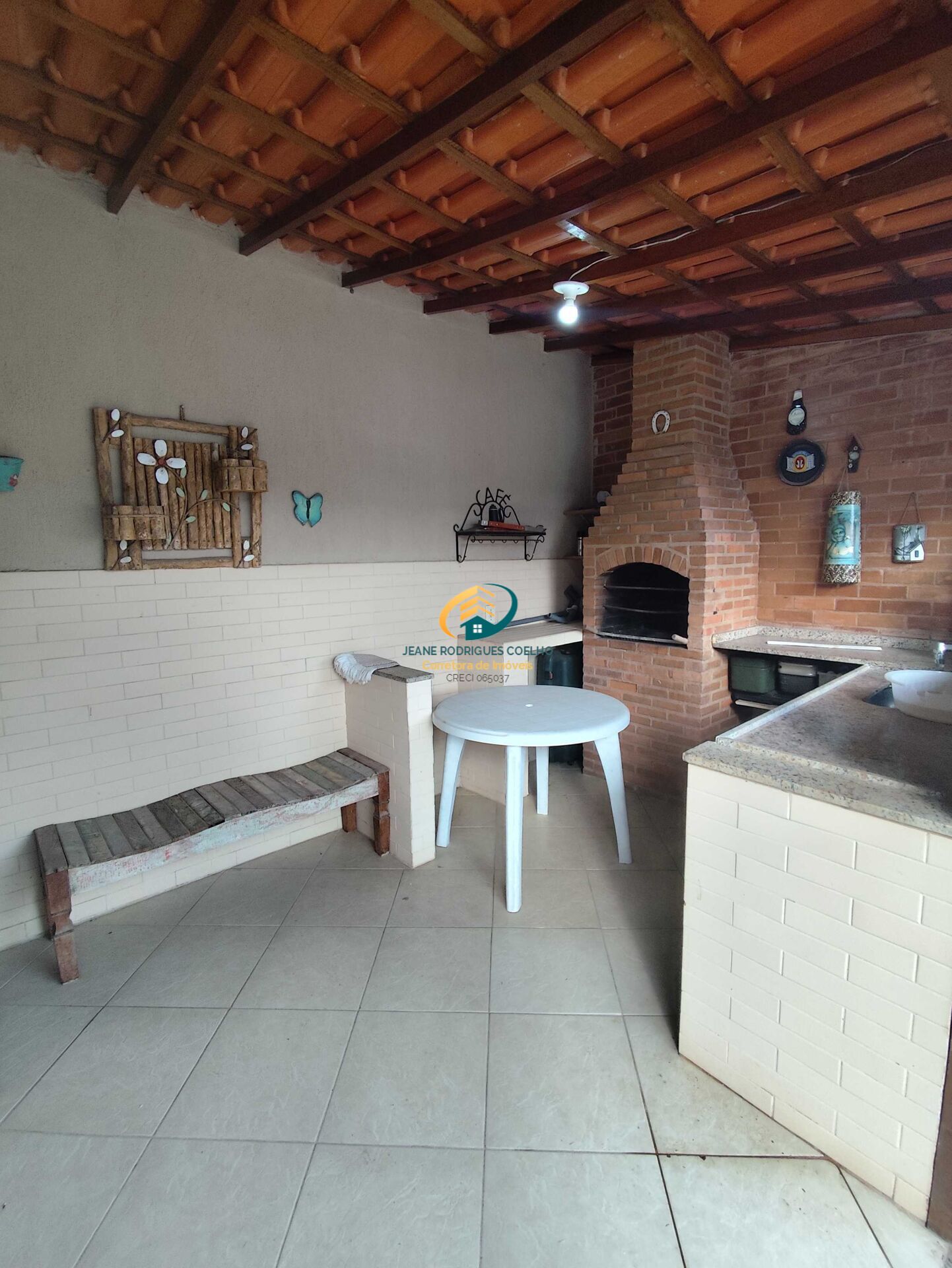 Área de churrasqueira e piscina de azulejo com banheiro externo