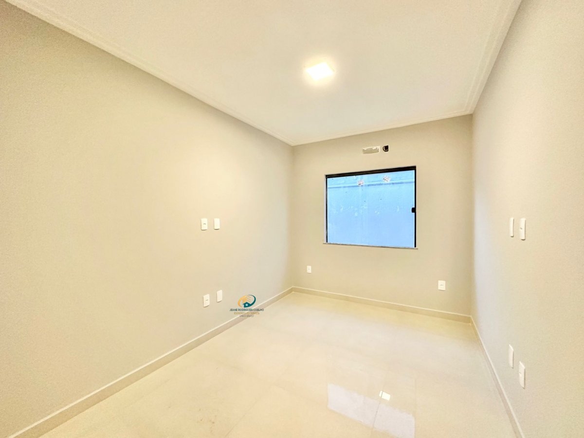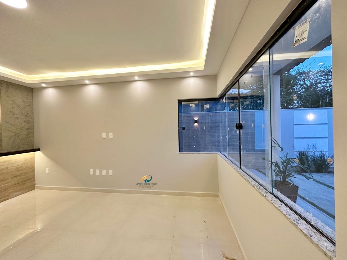 Composta de 3 quartos amplos sendo 1 suíte, sala grande com rebaixamento em gesso e iluminação indireta de led. Cozinha grande, banheiros com box e cuba sobrepostas. Área de serviço e varanda. Área externa com churrasqueira coberta, lavabo e chuveirão. Terreno gramado, portão em alumínio e um belo paisagismo.